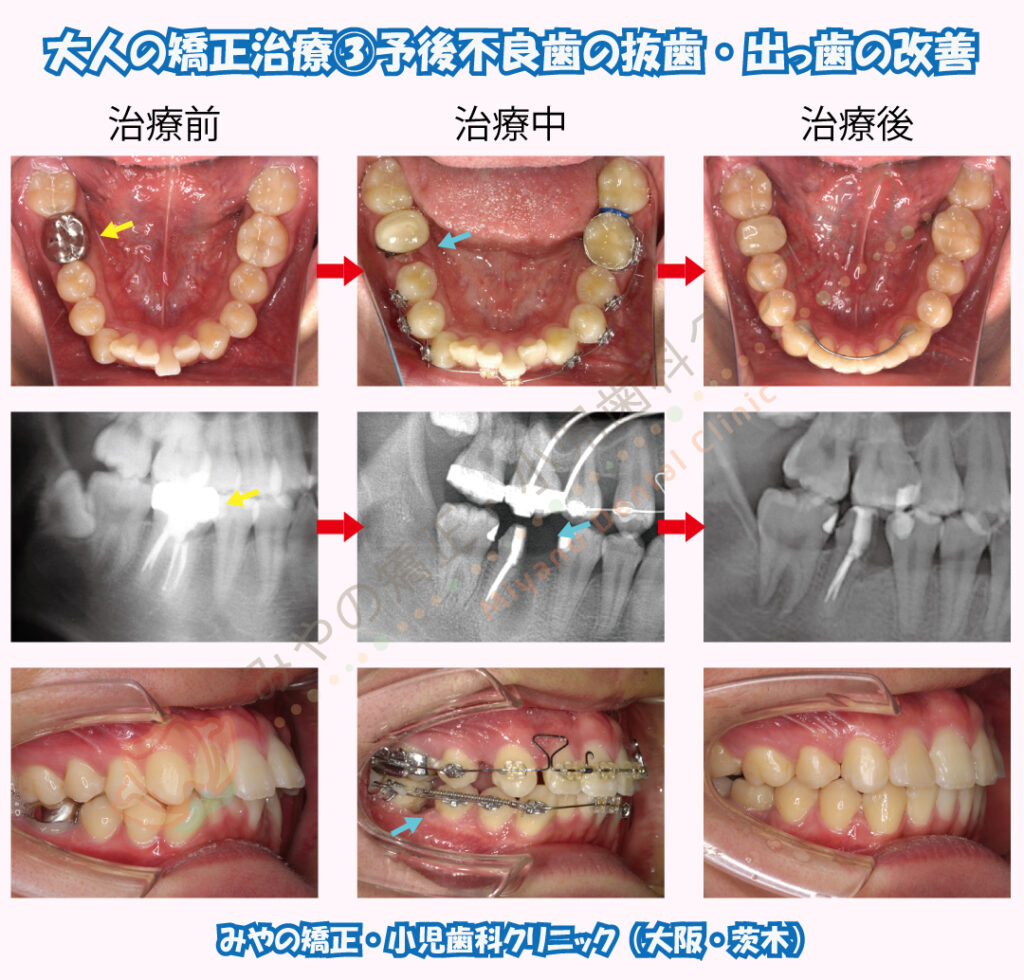 主訴である出っ歯の改善のためには一般的には小臼歯と呼ばれる歯を抜歯しますが、予後不良であった右下6を分割して抜歯し(青矢印)そのスペースを利用し出っ歯の改善を行った症例です。上顎は通法どおり4番目の小臼歯を抜歯し、約2年半で排列しました。(全顎矯正)矯正後、仮歯の修正をしていただき、治療は終了となります。